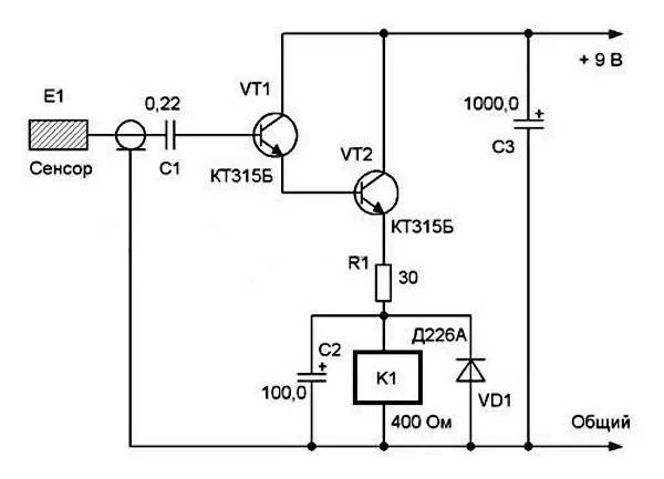 Основным исполняющим и коммутационным элементом, включающим непосредственно светильник, лампу или бра является реле К1. Оно может быть типа РЭС 55А или РЭС 55Б с током срабатывания около 15–20 мА. Диод VD1 выполняет роль защиты от перепадов напряжения при срабатывании реле, а конденсатор С2 сгладит пульсации, возникающие при этом. Резистор R1 лучше применить переменной конструкции, для надёжной работы реле. В пределах до 50–60 Ом. Сенсором может служить небольшой кусочек фольгированного текстолита или медной пластины. Он обладает высокой чувствительностью, поэтому если сенсор будет установлен на расстоянии от схемы, выполненной на плате, то провод нужно обязательно защитить от помех путём экранирования. В качестве источника питания может использоваться любой источник постоянного тока, батарейка или аккумулятор. Нужно помнить при монтаже полупроводниковых деталей что перегрев их нужно снизить к минимуму. Лампы, которые будут включаться с помощью силовых контактов реле стоит выбирать с минимальным потреблением мощности это: