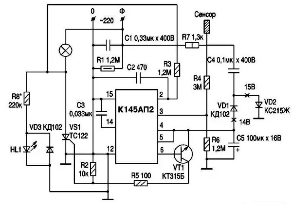 Схемотехнически все сенсорные выключатели похожи друг на друга. Работа их основана на одних и тех же процессах. Поэтому один узел устройства (имеется в виду узел коммутации) собран на таких трех основных элементах: